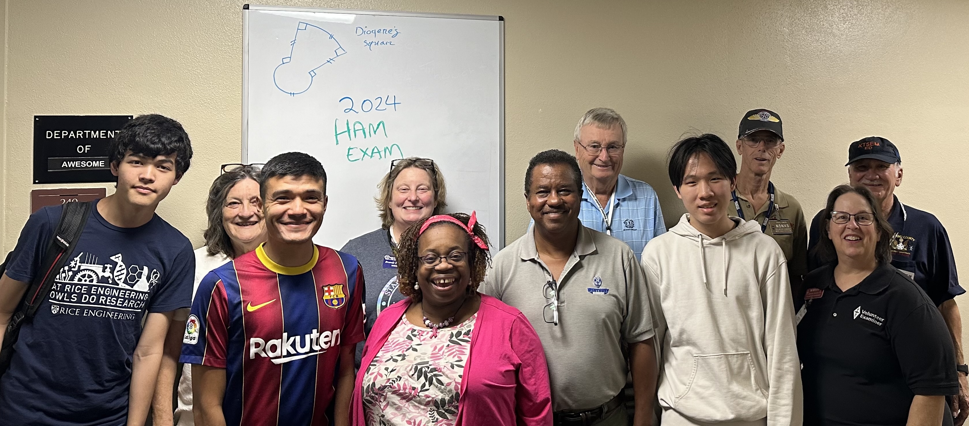 The below photo are the new licensees (one new General, 5 new Technicians) from 2024 with the Volunteer Examiners from the NARS club who administered the tests. From left: Luke Ritter KI5ZHW, new General; Dr. Pat, trustee W5TAR; Luis Nunez KJ5IRX, Brandy Lang WE9L (VE); Cristal Johnson KJ5IRW, Cedric Williams KJ5ISS, Dale Schmirler KN5DS (VE), Anthony Zhang KJ5IRD, Paul Owen N5NXS(VE), Sheree Horton (VE), and Ed Messman KT5EM (VE).